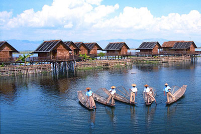 Breakfast at hotel. Transfer to the airport for the flight to Heho. From Heho, enjoy a scenic drive to Inle Lake, one of Myanmar best-known sights. The Intha people, mostly inhabit the lakeshores and floating villages. On arrival at Nyaung Shwe village, transfer by boat to start a sightseeing tour of Inle Lake including a chance to see the leg-rowing fishermen. Continue to see the floating gardens, built up from strips of water hyacinth and mud and anchored to the bottom with bamboo poles. In the afternoon continue to Phaung Daw Oo Pagoda, the weaving village of Inpawkhon and the jumping cat monastery. Overnight at hotel in Inle Lake.
